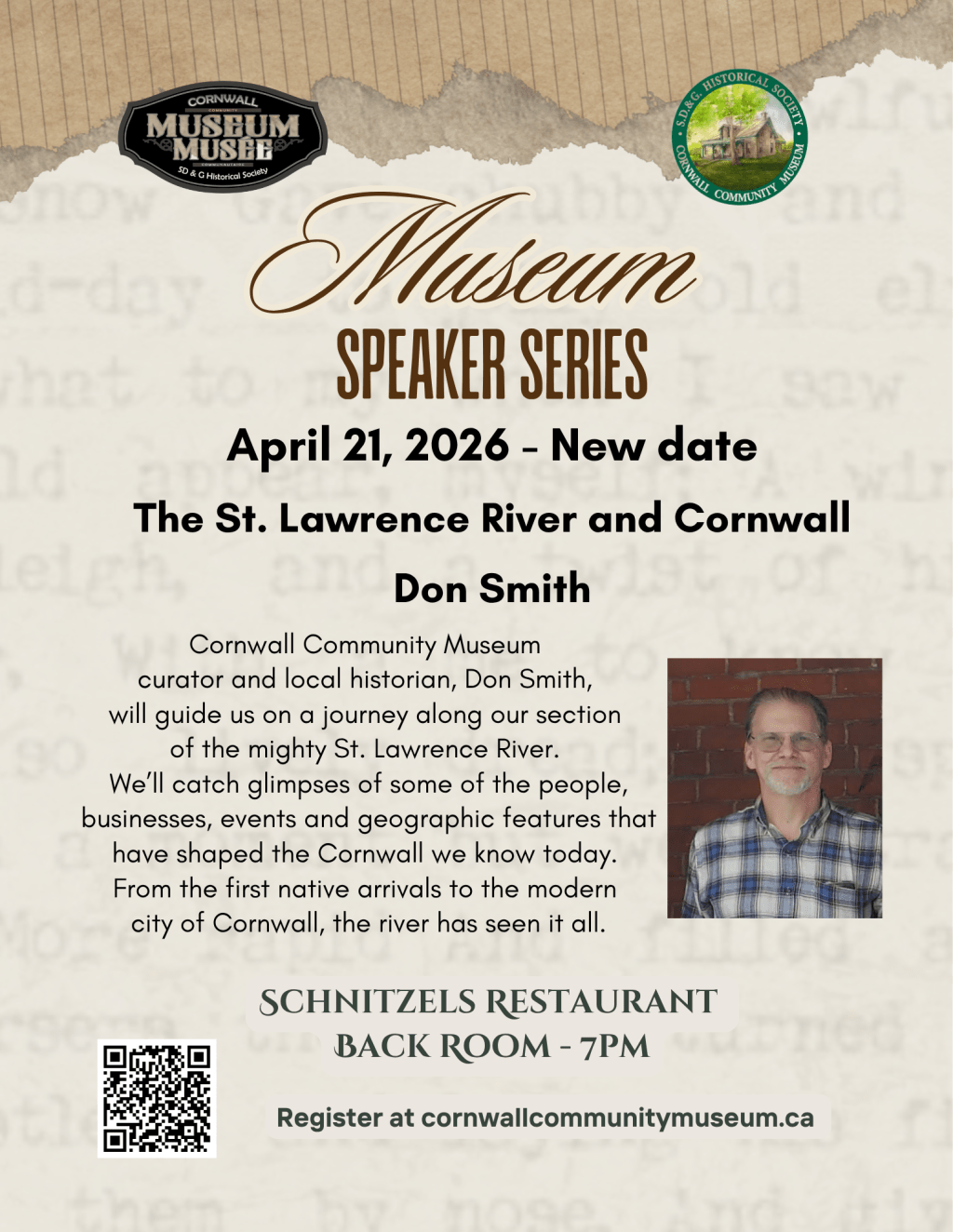 The SD&G Historical Society’s Speakers Series presentation with Cornwall Community Museum curator and local historian, Don Smith originally slated for March 10 will now be held Tuesday, April 21 at Schnitzels Restaurant at 7pm.